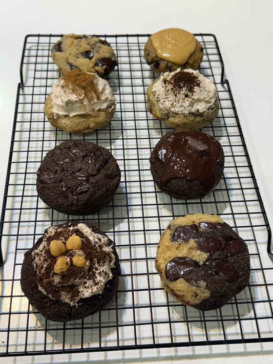 friends bundle 8 pieces.(almond flour) keto friendlyChocolate chips, Double chocolate, Half vanilla/Half chocolate, Chocolate hazelnut cream, Peanut butter, Vanilla chocolate chips, Cinnamon cream, Coffee cream.